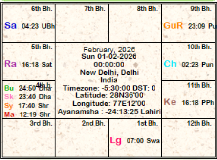 At the start of the month February, 2026 ravi in makara rasi and moves to kumbha on 14th of the month. Both these signs are owned by his bitter enemy, shani. Kuja is in his exaltation sign makara at the start of the month and moves to kumbha on 24th; He is combust during entire month. Budha transits in makara rasi for the first three days only. From 4th budha transits in kumbha rasi. Budha suffers combustion from 1st to 9th of the month. Also, he is retrograde from 26th of the month. During entire month of February, 2026 guru is retrograde in mithuna rasi. At the beginning of the month shukra is in makara rasi and moves to kumbha rasi on 7th February. Shukra is combust till 15th of the month. Shani, rahu and ketu transit in meena, kumbha and simha rasis respectively.