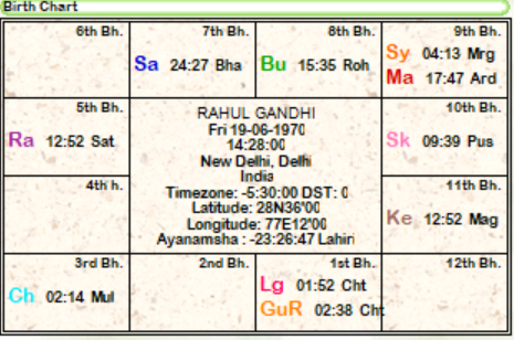 Sri Rahul Gandhi [19.06.1970, 14:28, New Delhi] has dhanur rasi rising at the time of birth. Very handsome young fellow (at 55 years of age). He is mischievous optimist and an eligible bachelor. He is like the owner of a big concern like big Adani group or National Harold assets as lagna lord shukra is in the 10th house. He desires a elegant office with perks like foreign trips, gala and show than achievements. As dhanur rasi person, he never learns from setbacks and has copious dreams. Any person with dhanur lagna is into traditional sports and games like yoga. Sri Rahul Gandhi does perform beautiful and difficult yoga postures. Unfortunately, he does not get much coverage! We always think what Baba said are miracle words and did miracles (or just magic?) and what all this man did are pappu acts! Transit in shani in meena causes lot of familial problems, loss of properties and rift or passing away of some well wishers. For any success he has to wait for the transit of shani in vrishabha rasi (Aug 2029 to May 2032). He can surely hope for performance in next loksaha elections. Again, he will go out of office when shani is the worst in the 8th, kataka rasi (Jan 2034 to April 2039).