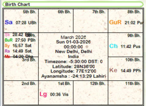 At the start of the month, ravi in kumbha rasi and moves into meena rasi on 16th of March. Kuja transits in kumbha rasi for the entire month and is combust till 26th; Similarly budha transits in kumbha during the month of March. Budha is retrograde till 21st and is combust till 13th of the month. Guru continues his transit in mithuna rasi and assumes direct motion from 12th March. Shukra in kumbha at the start of the month; Shukra is exalted in meena rasi from 3rd to 26th of March and moves into mesha thereafter. Shani, rahu and ketu continue their journeys in meena, kumbha and simha rasis respectively during the month of March. Shani is combust from 8th of March to 11th of next month.